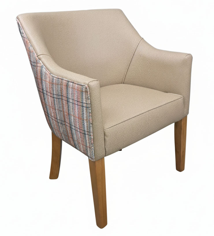 The LR2250 tub chair is a stylish and practical seating option, with legs polished in light oak and a comfortable seat and back upholstered in a mix of faux leather and fabric. Seat and inner back upholstered in Iliv Lismore in Sand, with the outer back upholstered in Iliv Q1898 Sanchita, Papaya.