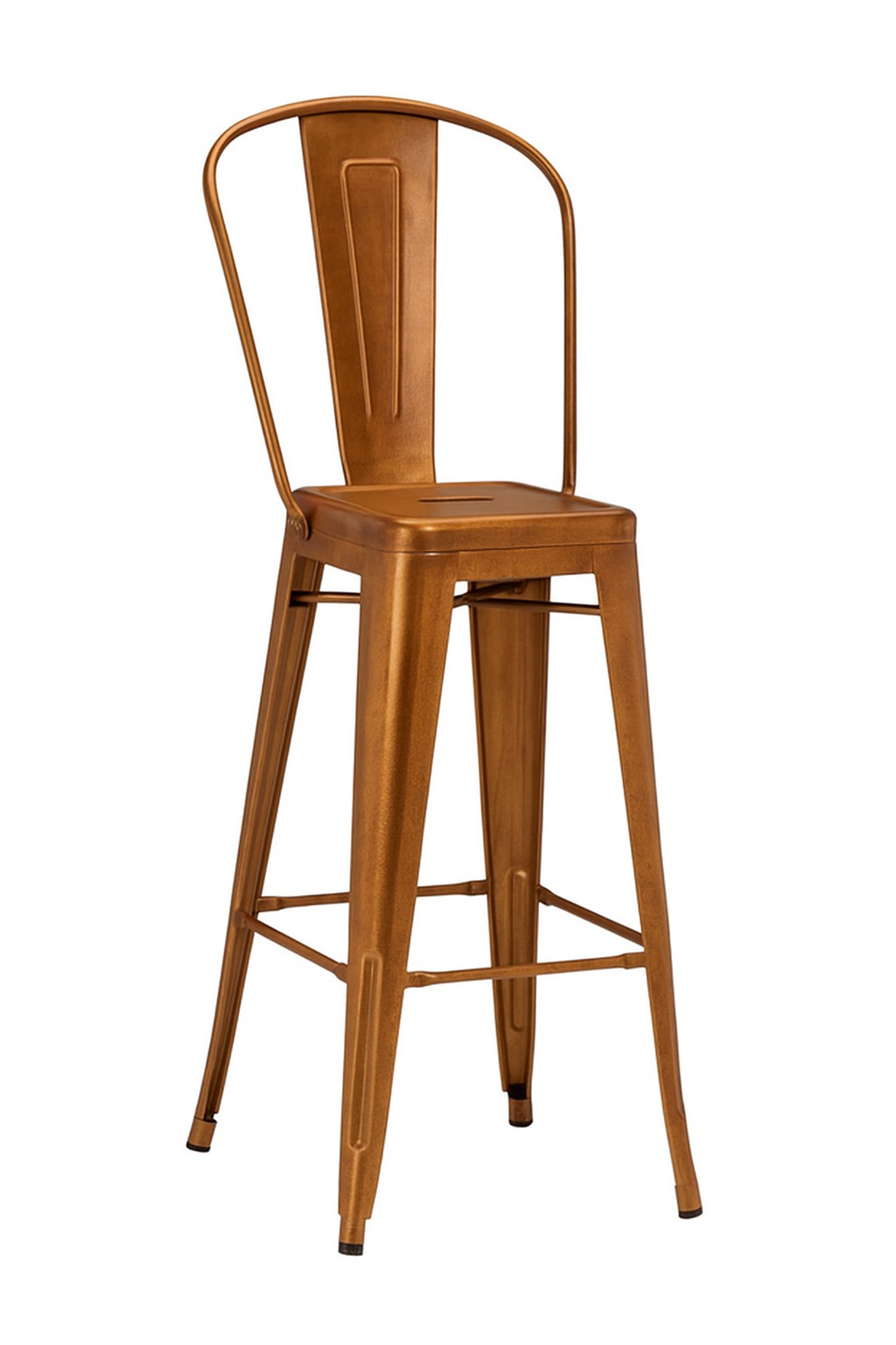 This industrial look metal high stool with a back is manufactured in steel and of a fully welded construction, with a vintage copper finish.